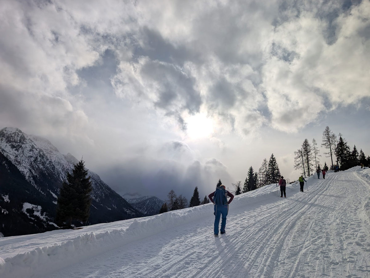 Die Schneeschuhe haben wir aufgrund Schneemangels zuhause gelassen, wobei sich nach dem 1. Anstieg doch eine geschlossene Schneedecke präsentierte. Der weiche Schnee machte das Stapfen eher mühsam, v.a. auf dem Abschnitt, der der Rodelbahn folgt. Abkürzungen führen ziemlich diritissima bis nach Hirschleiten und später durch den Wald.