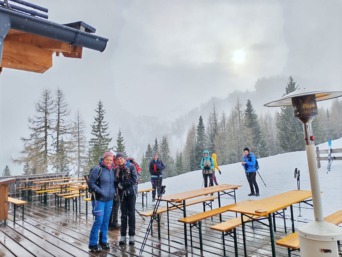 Im oberen Bereich schneite es dicke Flocken, wodurch ein stimmungsvoller Mix aus Sonne, Schnee und Nebel entstand. Die neue Kleinarlerhütte (1750 m) war sehr voll, bald bekamen wir aber Platz und wurden rasch und freundlich bedient. Der Rückweg folgte zuerst der Rodelbahn, dann ging es quer über die Wiesen und zuletzt ein Stück auf dem vereisten Kesselfall-Rundweg (Weg 80) zurück zur Bushaltestelle.